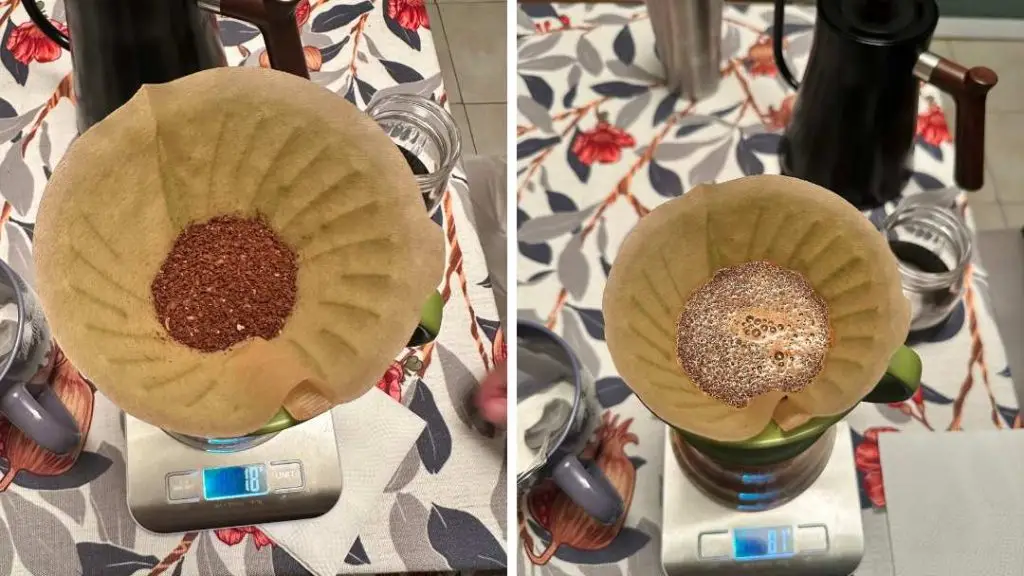 Add the coffee into the filter, turn on the scale and pour in about 75ml of water. Allow it all to drain and wait about 35 seconds before pouring more water. Then pour more water until the scale shows 150ml. Allow that to drain and do one more pour until it reads about 255.