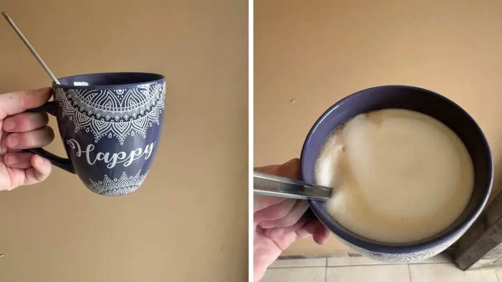 Once the coffee is finished filtering, I throw out the filter with the coffee and put the coffee in the cup with the collagen and stir until its dissolved. Then I add the milk and foam on top.