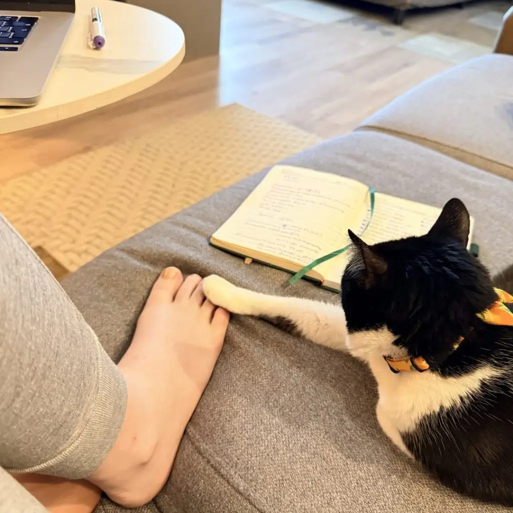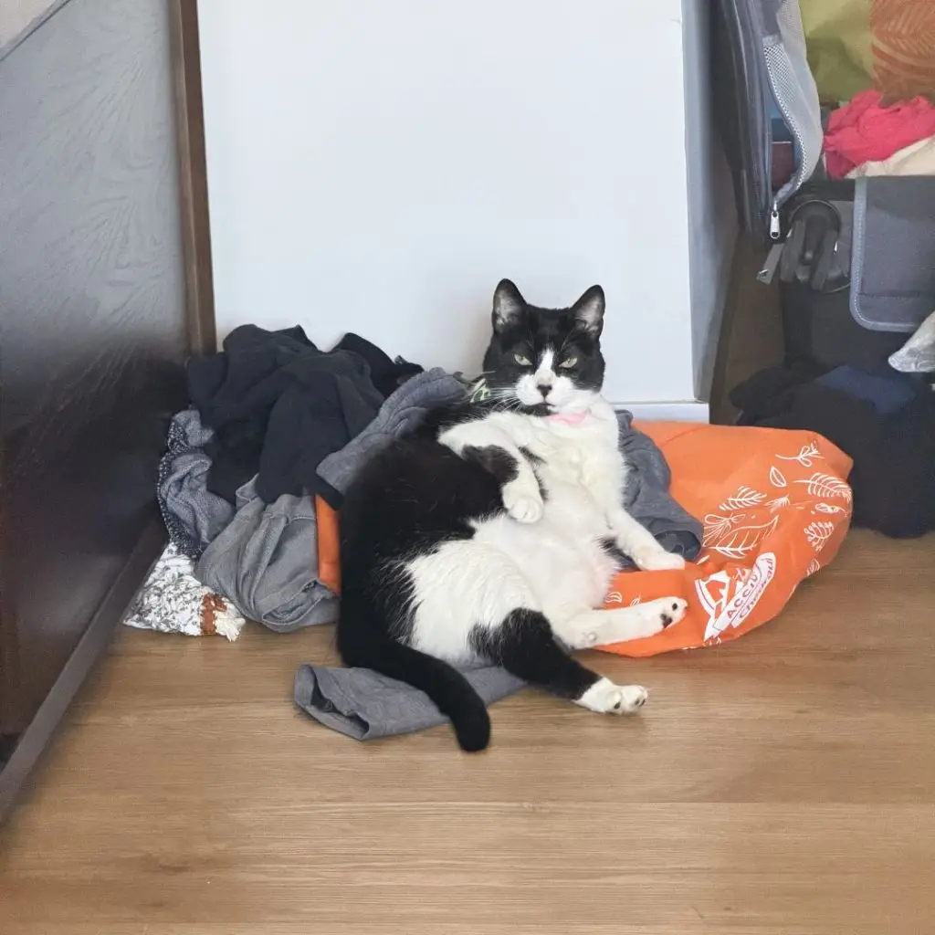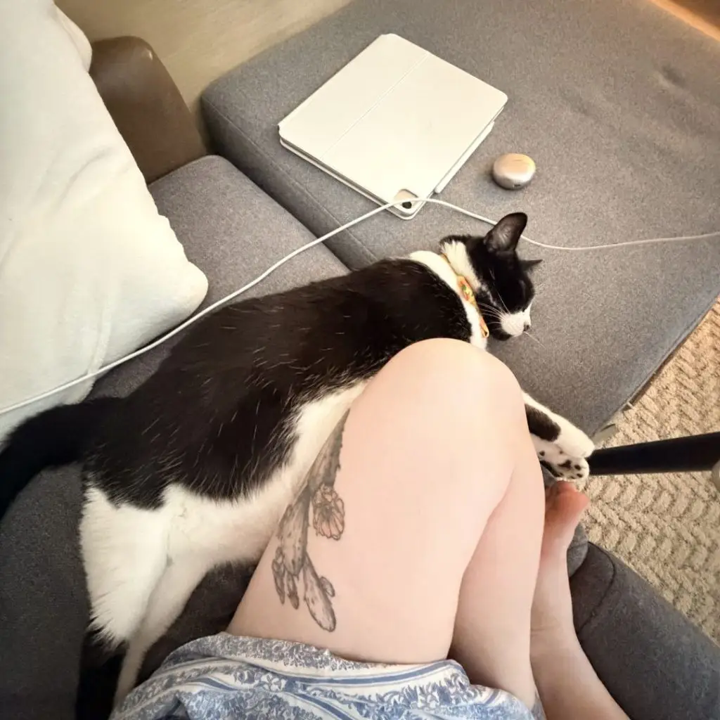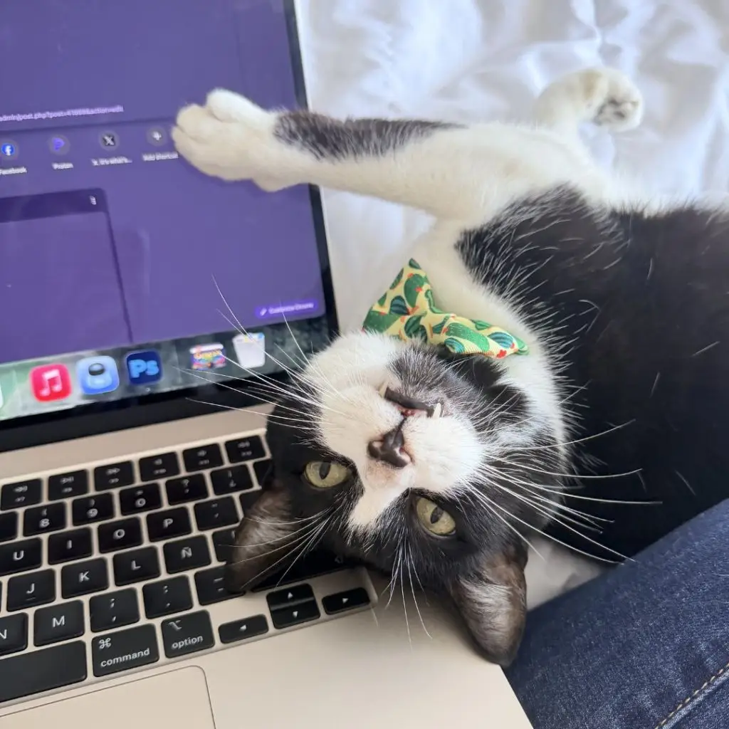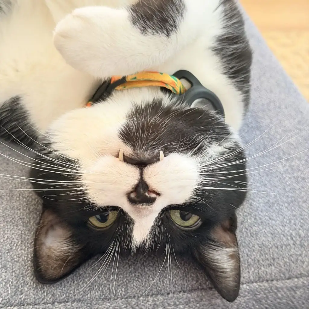 This is Chonky, a 6 year old female tuxedo cat with about 4 functional teeth (her canines only, long story involving inbred genetics) and I adopted her in Acapulco from a vet who gave her to me freshly fixed with the request I don’t let her on the street. She has only ended up in the street one time in her life and it scared the bejeesus out of her and me both, which is why she sports a collar with airtag embedded and of course, since she’s a tuxedo she gets herself a fashionable bowtie. Or 7…..or 10. She’s got a lot of bowties.